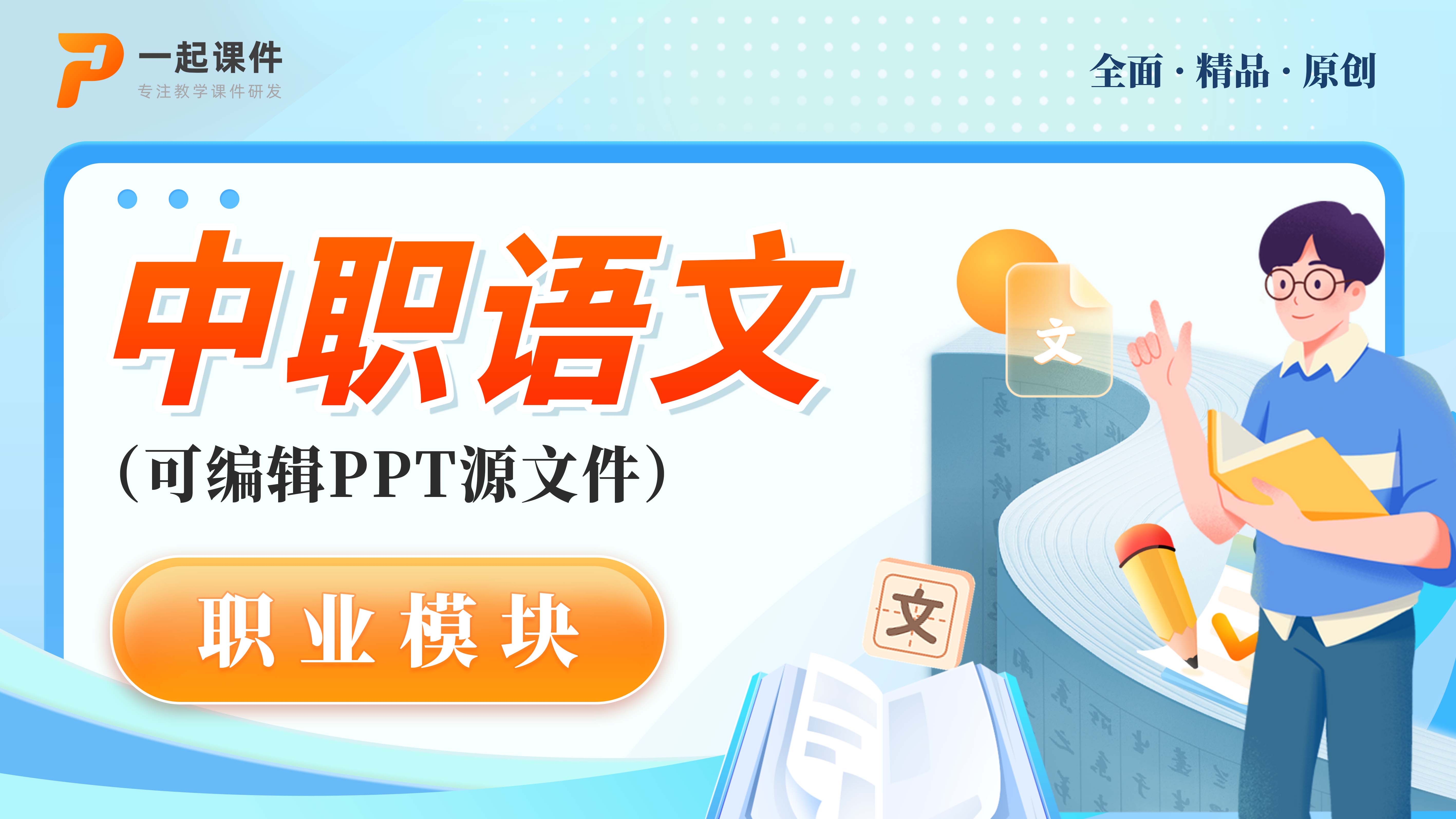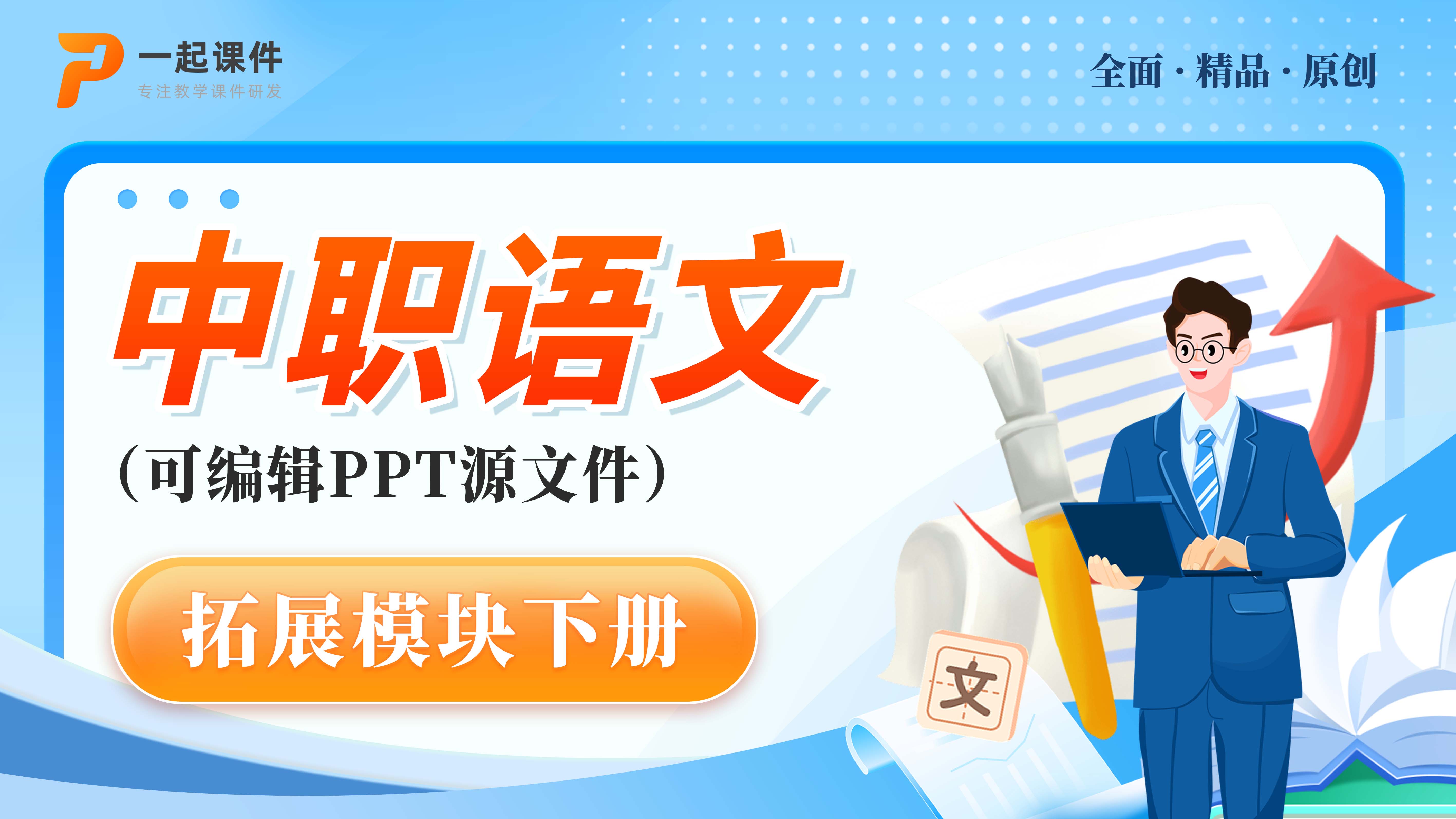 中职语文拓展模块上册课件紧扣教学要求,内容系统、结构清晰,涵盖多个板块。课件设计注重实用性与拓展性,结合经典文本与现实案例,帮助学生提升语言运用能力与人文素养。配套教学目标明确,便于教师课堂组织与学生自主学习,是中职语文教学的优质辅助资源。